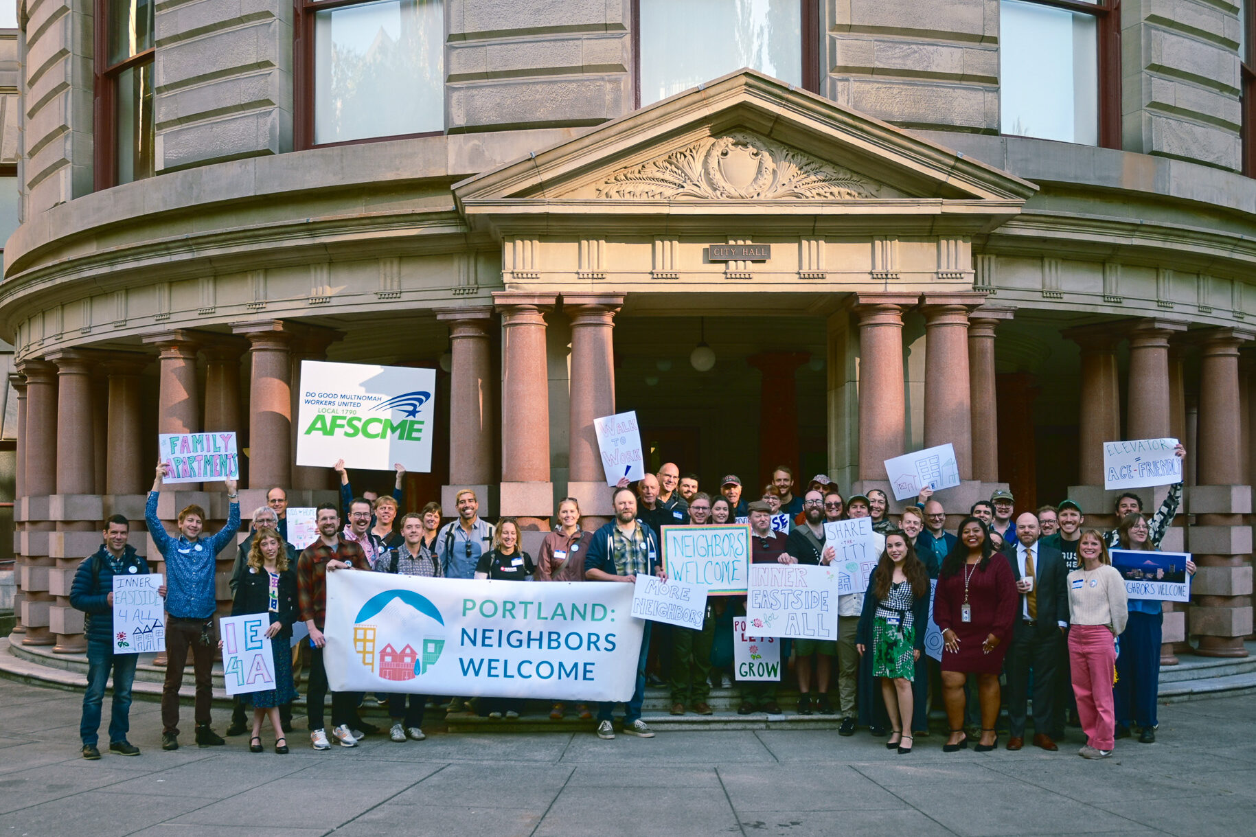 Here in Portland, we recently joined the local chapter Portland: Neighbors Welcome (P:NW) at a rally outside City Hall on September 25. The event urged City Council to allow more homes and greater housing diversity in Portland’s Inner Eastside.