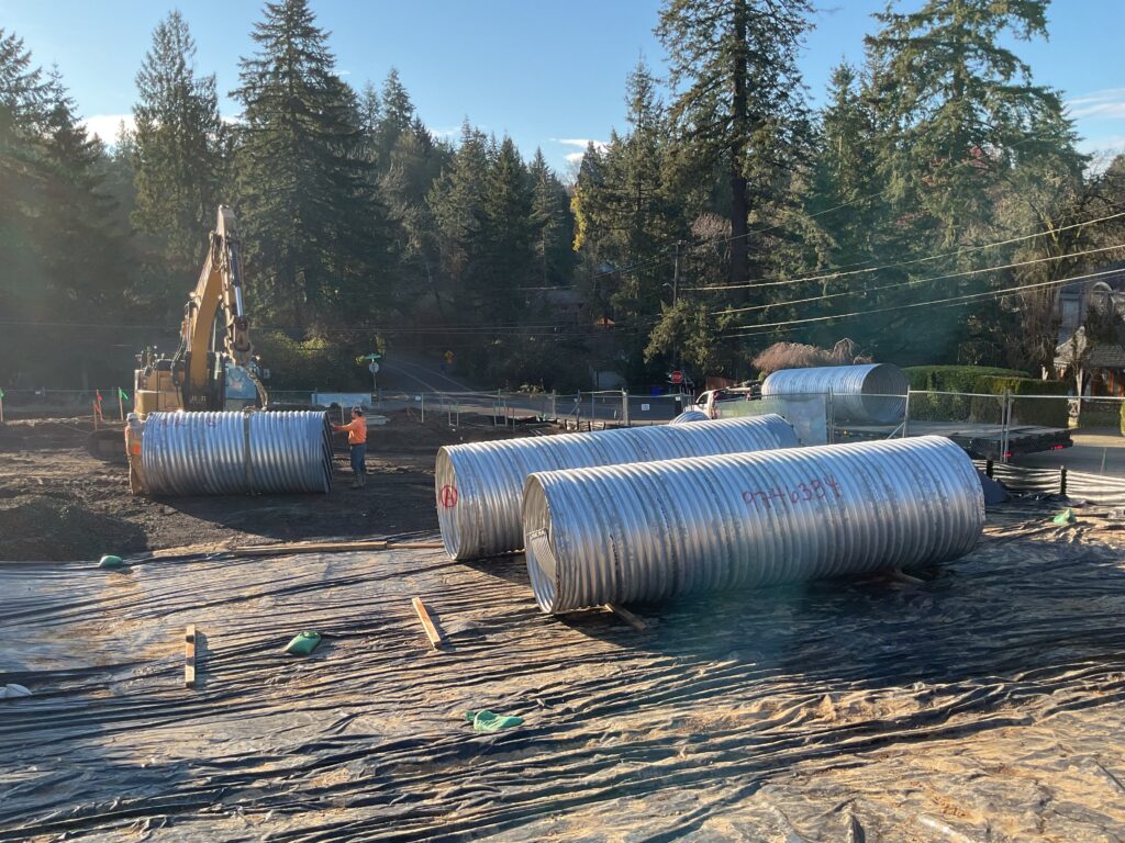Our largest development to date, Gooseberry Trails will build 52 homes in SW Portland’s Hillsdale neighborhood! The crew is hard at work getting utilities and infrastructure to the sprawling site and finishing the retaining wall on the private road.