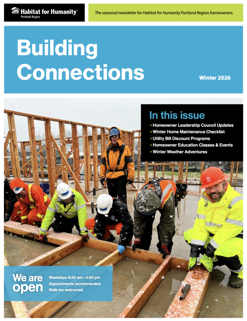 The Building Connections homeowner newsletter is a quarterly print and digital newsletter mailed to our homeowners that provides stories, valuable information, and important events that affect Habitat homeowners.